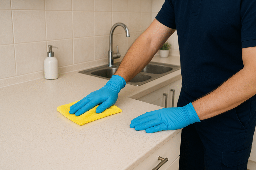 A professional cleaner wearing a dark navy uniform and bright blue nitrile gloves is thoroughly wiping a smooth beige quartz kitchen countertop using a clean yellow microfiber cloth. The cleaner’s hands are positioned firmly, showing attention to detail and steady pressure to remove dirt, stains, and bacteria from the surface.